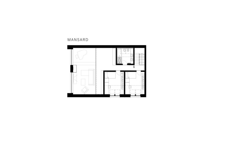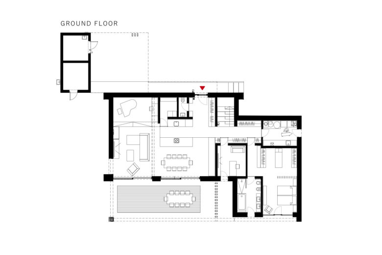 The ground floor of the house includes living and service areas, such as a bright living room, a functional kitchen with an island and pantry, an office, a restroom, and the master bedroom with a walk-in closet and an en-suite bathroom. The rooms on the ground floor are bathed in natural light thanks to large triangular glazing in the gable, creating a sense of spaciousness and airiness. The living areas are designed for socializing, with special corners for a piano and bar accessible through elegant pocket doors. The kitchen island is the heart of the home, facilitating food preparation and socializing, while a convenient hidden passage to the pantry ensures a tidy space.